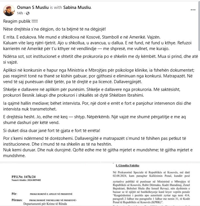 “Aplikoi në konkursin e hapur nga Ministria e Mbrojtjes për psikologe klinike, ia fshehën dokumentet; pas reagimit tonë na thanë se kishin gabuar, por gjithsesi e eliminuan nga konkursi,” ka shkruar Musliu.