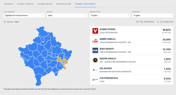 Në Komunën e Gjilanit, kandidati i Lëvizjes Vetëvendosje, Alban Hyseni është shumë pranë të sigurojë mandatin për kryetar komune pa balotazh sipas rezultateve të deritanishme ku kryeson me 49.82% të votave.