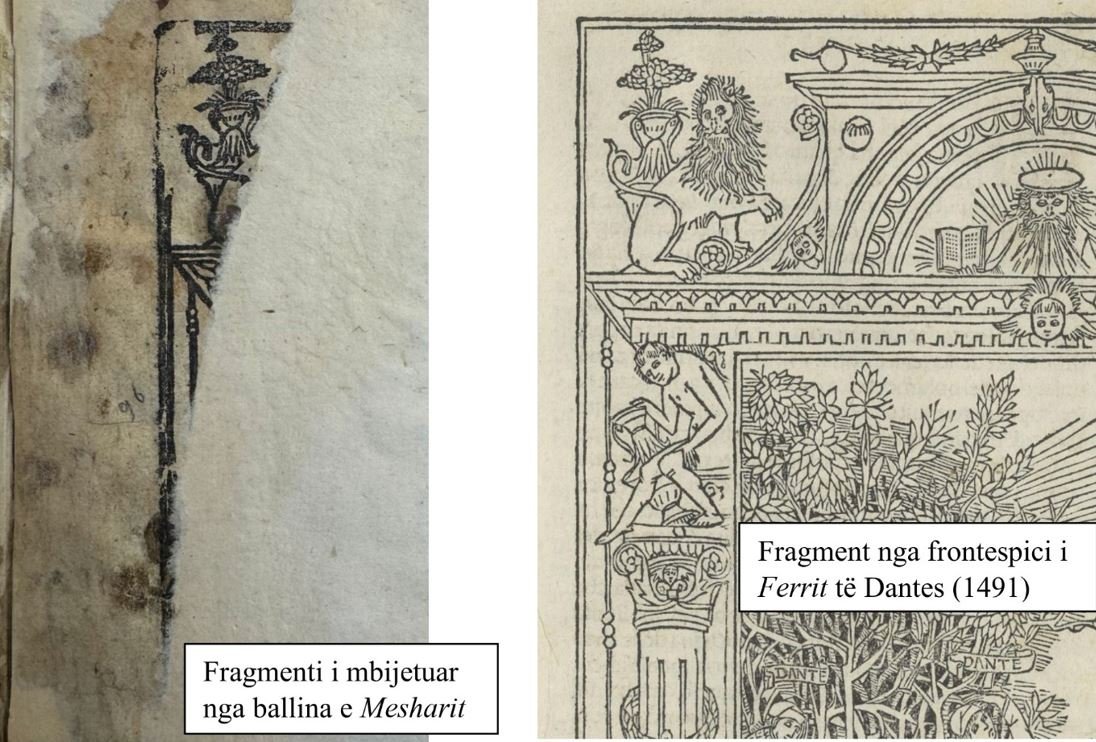 Tashmë dimë se grafemat e përdorura për shtypshkrimin e Mesharit janë po ato të përdorura nga Benardino Benali në veprat e botuara nga 1491 deri rreth 1520, gjithmonë nga të dhënat që zotërojmë deri më tani. Pikërisht për këtë arsye i jemi drejtuar në fillim botimeve të Benalit për të gjetur ndonjë frontespic që të përmbante fragmentin e mbijetuar të Mesharit. Duke shikuar me vëmendje frontespicet e botimeve të tij, nga i cili kanë mbijetuar rreth 200 vepra, kemi zbuluar se ai është i pari që ka përdorur një kornizë ksilografike, ku gjendet edhe fragmenti i lartpërmendur. Këtë kornizë balline, gjithmonë me brendi të ndryshme, e kemi gjetur: 1. Te botimet dhe ribotimet e Komedisë Hyjnore të Dantes; 2. Te botimet dhe ribotimet e Ngadhënjimeve të Petrarkës dhe 3. Te disa vepra të tjera të kësaj periudhe, por zakonisht nga të njëjtit shtypshkrues.