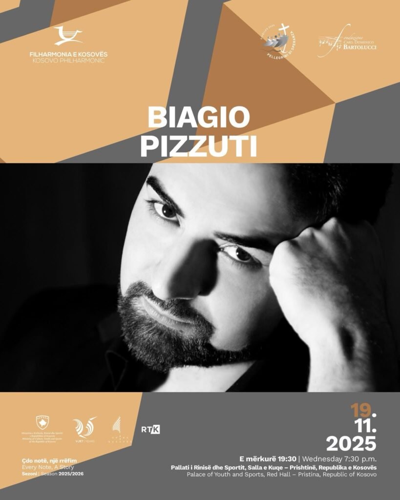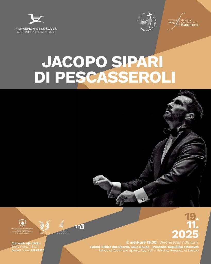 Koncert premierë – Orkestra dhe Kori i Filharmonisë së Kosovës, si dhe Kori i Operës së Kosovës, nën drejtimin e mjeshtrit italian Jacopo Sipari di Pescasseroli, do të sjellin një koncert ekskluziv më 19 nëntor 2025, nga ora 19:30, në Sallën e Kuqe të Pallatit të Rinisë dhe Sporteve në Prishtinë. Koncerti organizohet në bashkëpunim me Fondacionin Domenico Bartolucci, me mbështetjen e Qeverisë së Republikës së Kosovës, Ministrisë së Kulturës, Rinisë dhe Sportit dhe Ambasadës së Kosovës në Romë. Ky koncert i paraprin prezantimit të Filharmonisë së Kosovës në Romë më 23 nëntor 2025 – si pjesë e ngjarjeve në shënim të Jubileut në Vatikan. Në këtë koncert do të interpretohet oratoriumi për solistë, kor dhe orkestër “La Tempesta sul Lago” nga Domenico Bartolucci. Kasti i solistëve përfshin emra të njohur si Besa Llugiqi (soprano, Kosovë), Ivana Hoxha (mexosoprano, Shqipëri), Carlos Cardoso (tenor, Portugali) dhe Biagio Pizzuti (bas, Itali), ndërsa koret janë përgatitur nga dirigjenti Hajrullah Syla. Pas Prishtinës, ky koncert do të mbahet në Romë, në Bazilikën Santa Maria in Aracoeli, duke shënuar rikthimin e Filharmonisë së Kosovës me të dy njësitë e saj në Vatikan pas gati 10 vjetësh. Për të marrë pjesë në koncertin e Prishtinës, ju lutemi rezervoni ulësen tuaj në këtë link.