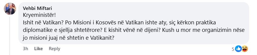 “Kryeministër! Ishit në Vatikan? Po Misioni i Kosovës në Vatikan, a ishte aty, ashtu siç e kërkon praktika diplomatike dhe sjellja shtetërore? A e kishit vënë në dijeni? Kush u mor me organizimin, nëse jo misioni juaj në shtetin e Vatikanit?”, ka shkruar Miftari./Lajmi.net/PortaliAlarm/