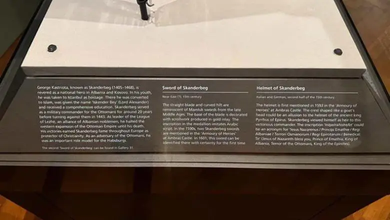 Në Muzeun e Historisë së Artit në Vienë (KHM), ku përkrenarja dhe shpata e Gjergj Kastriotit, Skënderbeut tashmë shoqërohen me një përshkrim të plotë historik që përcakton qartësisht identitetin, origjinën dhe rolin e tij si udhëheqës shqiptar. Ky ndryshim vjen vetëm dy muaj pasi një peticion i iniciuar nga inxhinieri Azmer Duleviç dhe gazetari Ermal Peçi kërkoi korrigjimin e informacionit të munguar për figurën e heroit kombëtar.