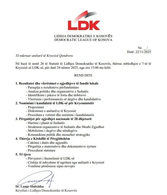 Ky zhvillim tregon se LDK po synon të hyjë në garën e 28 dhjetorit me strukturë të konsoliduar dhe me një figurë të qartë udhëheqëse, ndërsa skena politike pritet të dinamizohet edhe më shumë ditëve në vijim, teksa partitë finalizojnë koalicionet e mundshme dhe listat zgjedhore. /Telegrafi/Alarm/