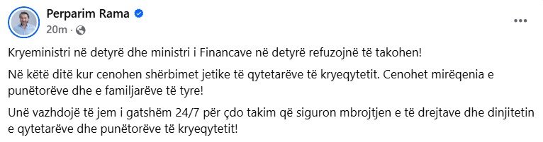 Pak kohë pas këtij postimi, Rama ka dalur me një postim tjetër ku ka deklaruar se Kurti dhe Murati nuk po pranojnë të takohen për të diskutuar rreth zgjidhjeve të mundshme për problemet e fundit në kryeqytet, “Kryeministri në detyrë dhe ministri i Financave në detyrë refuzojnë të takohen!” shkroi ai./PortaliAlarm/