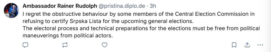 “Më vjen keq për sjelljen penguese të disa anëtarëve të Komisionit Qendror të Zgjedhjeve në refuzimin për të certifikuar Listën Serbe për zgjedhjet e ardhshme të përgjithshme. Procesi zgjedhor dhe përgatitjet teknike për zgjedhjet duhet të jenë të lira nga manovrimet politike nga aktorët politikë”, ka shkruar ambasadori gjerman./lajmi.net/PortaliAlarm/