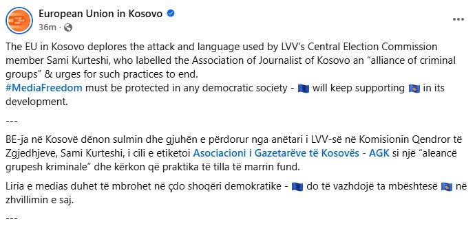 “BE-ja në Kosovë e dënon sulmin dhe gjuhën e përdorur nga anëtari i LVV-së në Komisionin Qendror të Zgjedhjeve, Sami Kurteshi, i cili e quajti Asociacionin e Gazetarëve të Kosovës – AGK “aleancë të grupeve kriminale”, dhe bën thirrje që praktika të tilla të marrin fund. Liria e medias duhet të mbrohet në çdo shoqëri demokratike – BE do të vazhdojë ta mbështesë Kosovën në zhvillimin e saj”, thuhet në reagim.